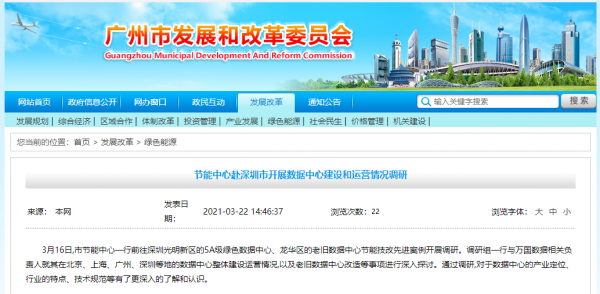 据广东省发改委网站显示,3月16日,广州市节能中心一行前往深圳光明新区的5A级绿色数据中心、龙华区的老旧数据中心节能技改先进案例开展调研。