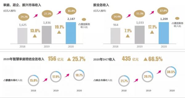 2020年,中国移动政企客户数达 1384 万家,净增 356 万家。专线收入达240亿元,同比增长19.3%;DICT收入达435亿元,同比增长 66.5%,对通信服务收入的增量贡献达到 2.6 个百分点;其中,移动云收入达92 亿元,同比增长353.8%。