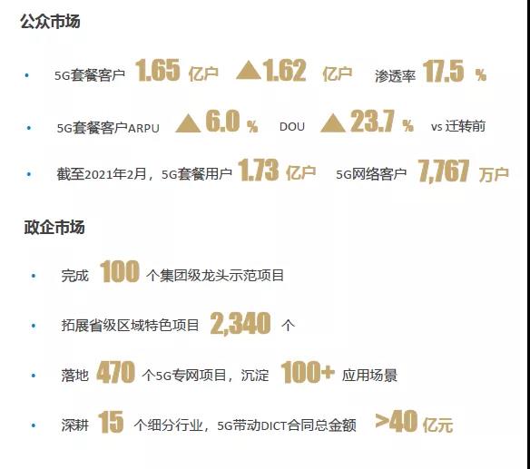 在个人市场,中国移动依然一马当先。截至2020年12月底,中国移动的移动客户数达9.42亿户,其中5G套餐客户达1.65亿户,净增 1.62 亿户,保持行业领先。移动ARPU为47.4 元,降幅同比收窄4个百分点;手机上网DOU提升39%,达9.4GB。