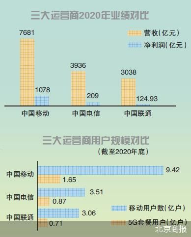 北京商报记者注意到,尽管营收与净利均同比增长,但三大运营商2020年在用户发展方面的表现却相差巨大,其中中国电信是三大运营商中唯一移动用户数实现正增长的。