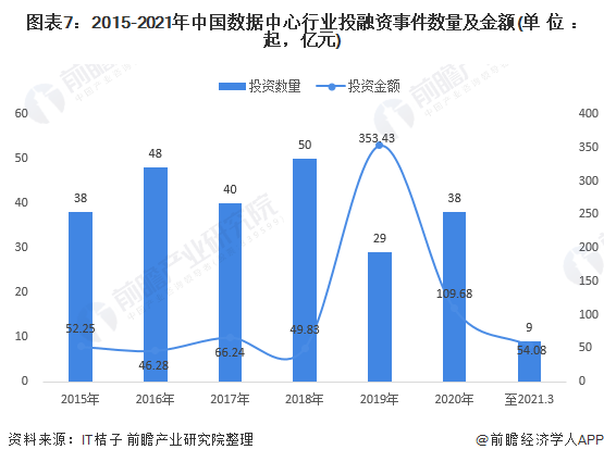 从投资金额来看,2019年数据中心行业投资金额较往年大幅上升,达到353.43亿元,2020年为109.68亿元。