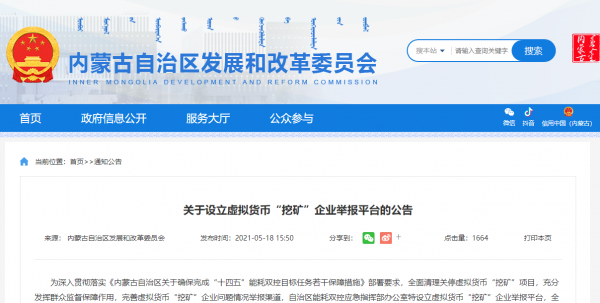 5月18日,内蒙古自治区发展和改革委员会发布公告,设立虚拟货币“挖矿”企业举报平台,贯彻落实全面清理关停虚拟货币“挖矿”项目。