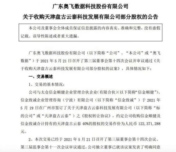 5月21日,奥飞数据发布公告表示,与信金顺健、信金致诚于5月19日在广州市签订了关于天津盘古云泰的《股权转让协议》,约定收购天津盘古云泰40%的股权的交易作价为1.22亿元。