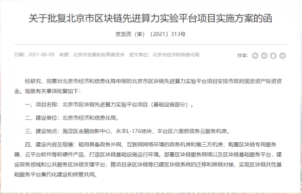近日,北京市发改委网站发布《关于批复北京市区块链先进算力实验平台项目实施方案的函》,批复同意对北京市经济和信息化局申报的北京市区块链先进算力实验平台项目安排市政府固定资产投资资金。